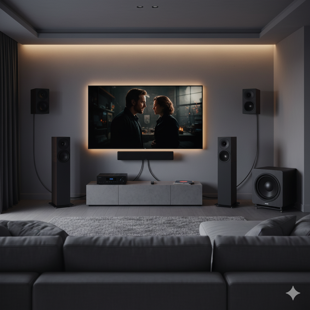 Os sistemas 5.1 equilibram imersão e custo, enquanto os sistemas 7.1 e Atmos adicionam canais de altura para detalhes espaciais verticais, exigindo uma calibração de ambiente mais complexa.